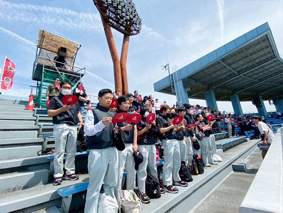 2025年5月9日、岡崎事業所では、三菱自動車岡崎硬式野球部の試合を応援し、チームの熱い戦いに声援を送りました。